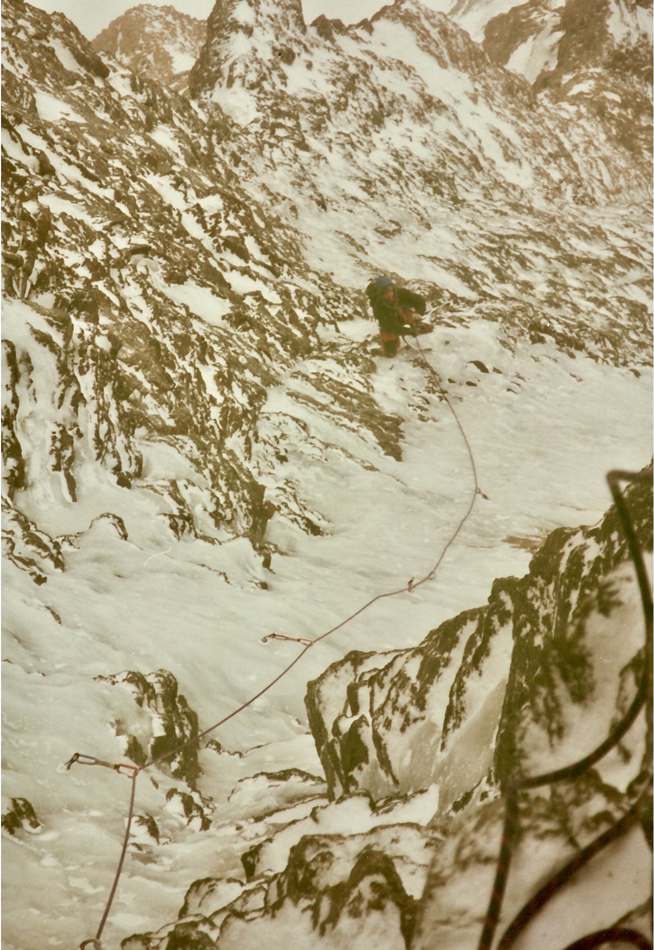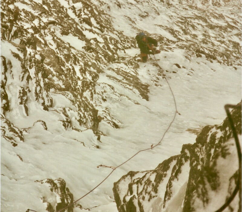 Ich erinnere mich, dass wir in einem steilen Eisfeld starteten. Nach ein paar Seillängen wechselte das Gelände in steileres, kombiniertes Terrain – ausgesetzt und ernst. Gerade hinauf wurde es immer steiler, vermutlich senkrecht, und eine Seillänge erschien uns besonders schwierig und zeitaufwändig. Der logische Ausweg führte uns rechts, eher abdrängend, hinaus zur Nordwandrippe. Von dort ging es nach circa zwei Seillängen wieder leicht nach links, wo wir erneut auf unsere erkennbare Eislinie trafen, die sich für etwa zwei Seillängen durchzog.