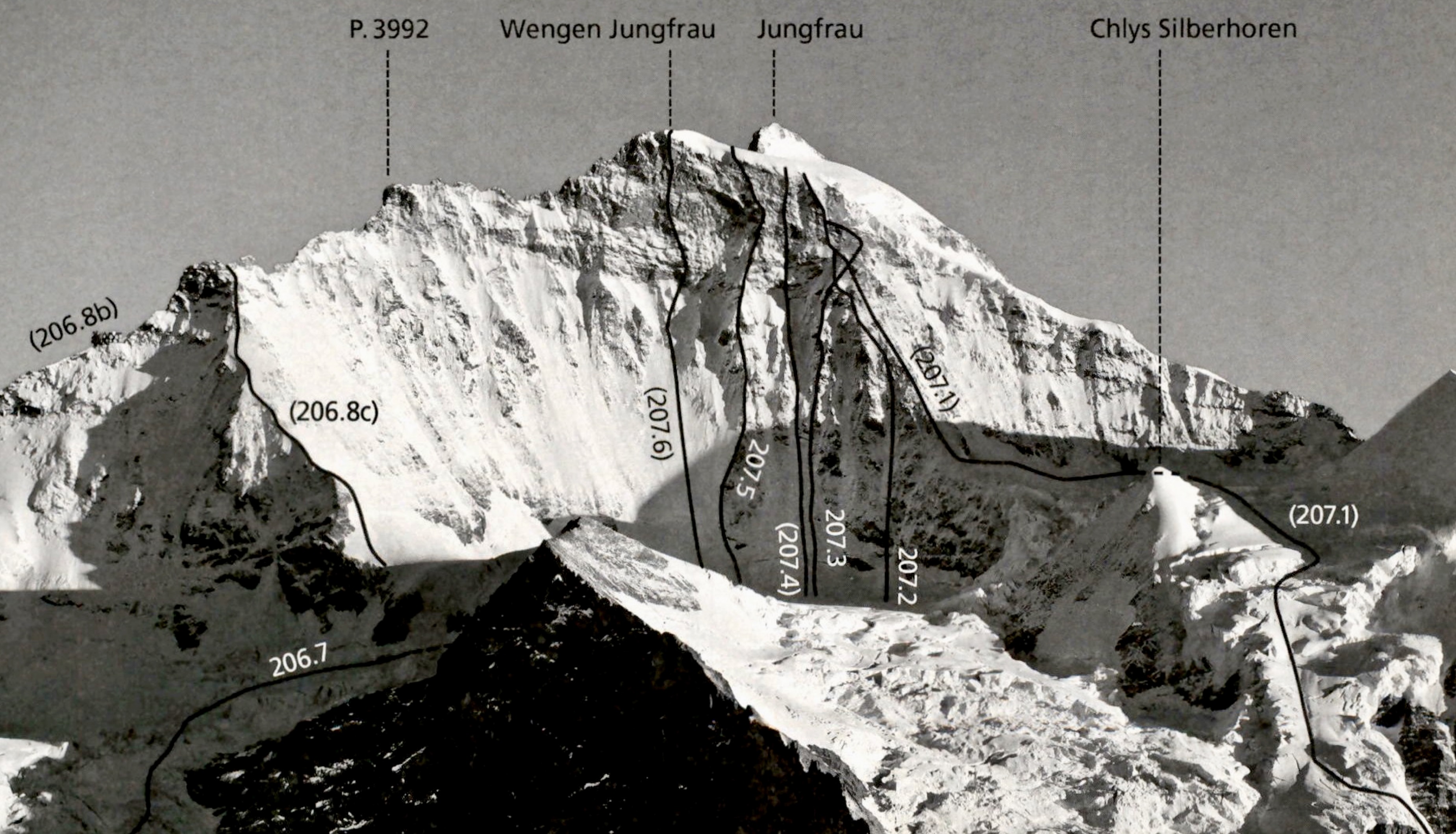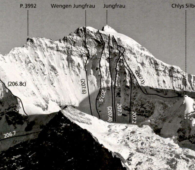 Also starteten wir vom Jungfraujoch in dieses Abenteuer und traversierten unterhalb der Nordwand der Jungfrau. Exponiertes Gelände – ein Ort, an dem man besser nicht stürzt, und das gleich von Beginn an. Unser Zustieg führte uns über den Giesengletscher in direkter Falllinie zu der dünnen Eisspur weit oben im Gipfelbereich. Wenn ich mir heute das Foto im SAC-Führer anschaue, scheint es, als wären wir im Bereich der heutigen Linien 207.4 oder 207.3 eingestiegen, egal.